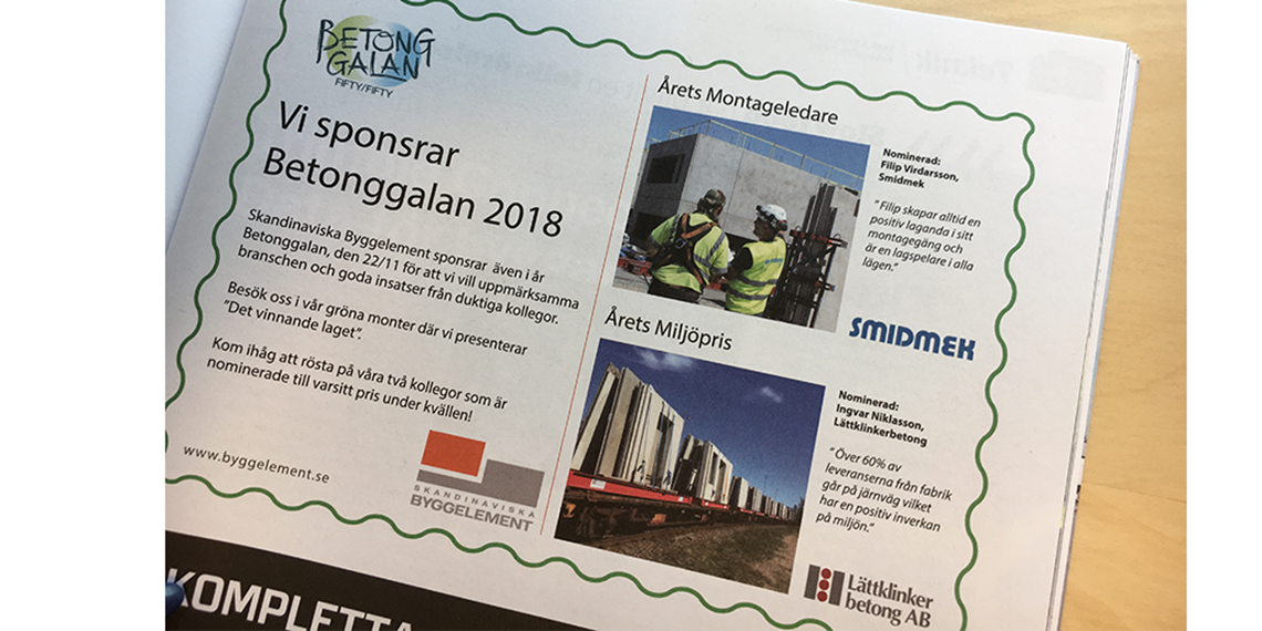 Under kvällen delas pris ut i åtta olika kategorier inom branschen. Förra året vann en av våra kollegor priset i kategorin Ung&Tung. I år har våra systerbolag, Lättklinkerbetong och Smidmek varsin nominerad medarbetare som vi såklart håller tummarna extra hårt för.