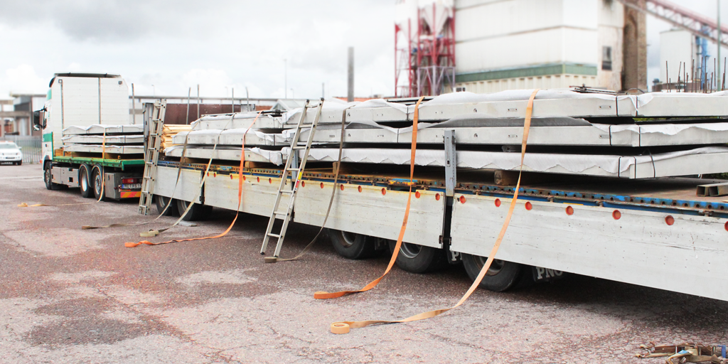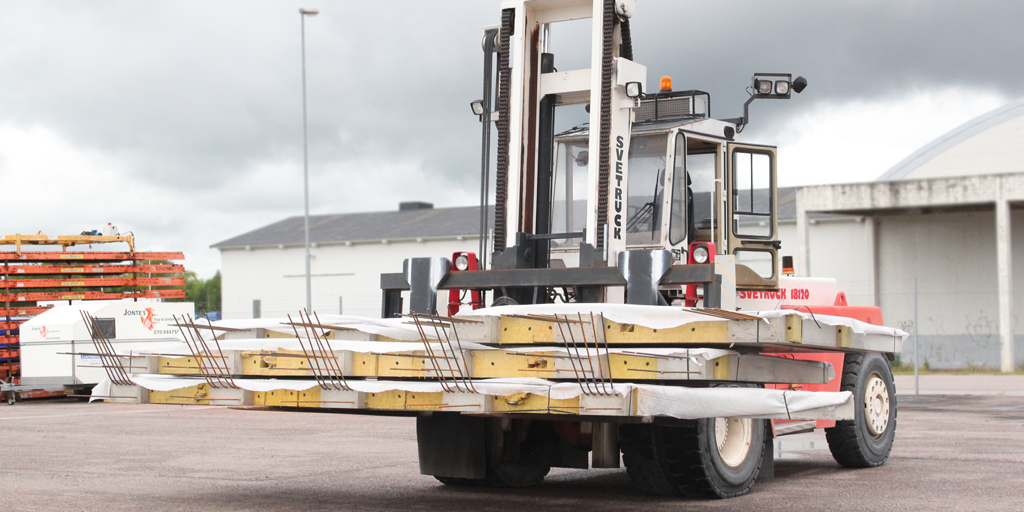 Balkongplattan levereras monteringsklar till byggarbetsplatsen. Plattan lyfts på plats med kran och monteras på bockrygg och stämp.