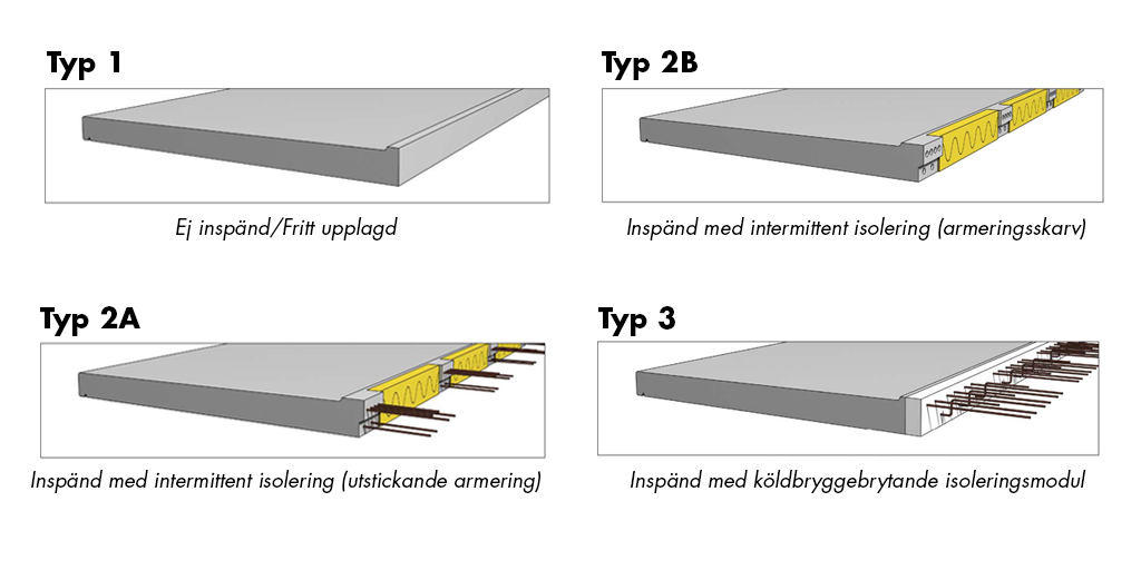 - Typ 2. Inspänd med intermittent isolering (utstickande armering (2A) eller armeringsskarv (2B))