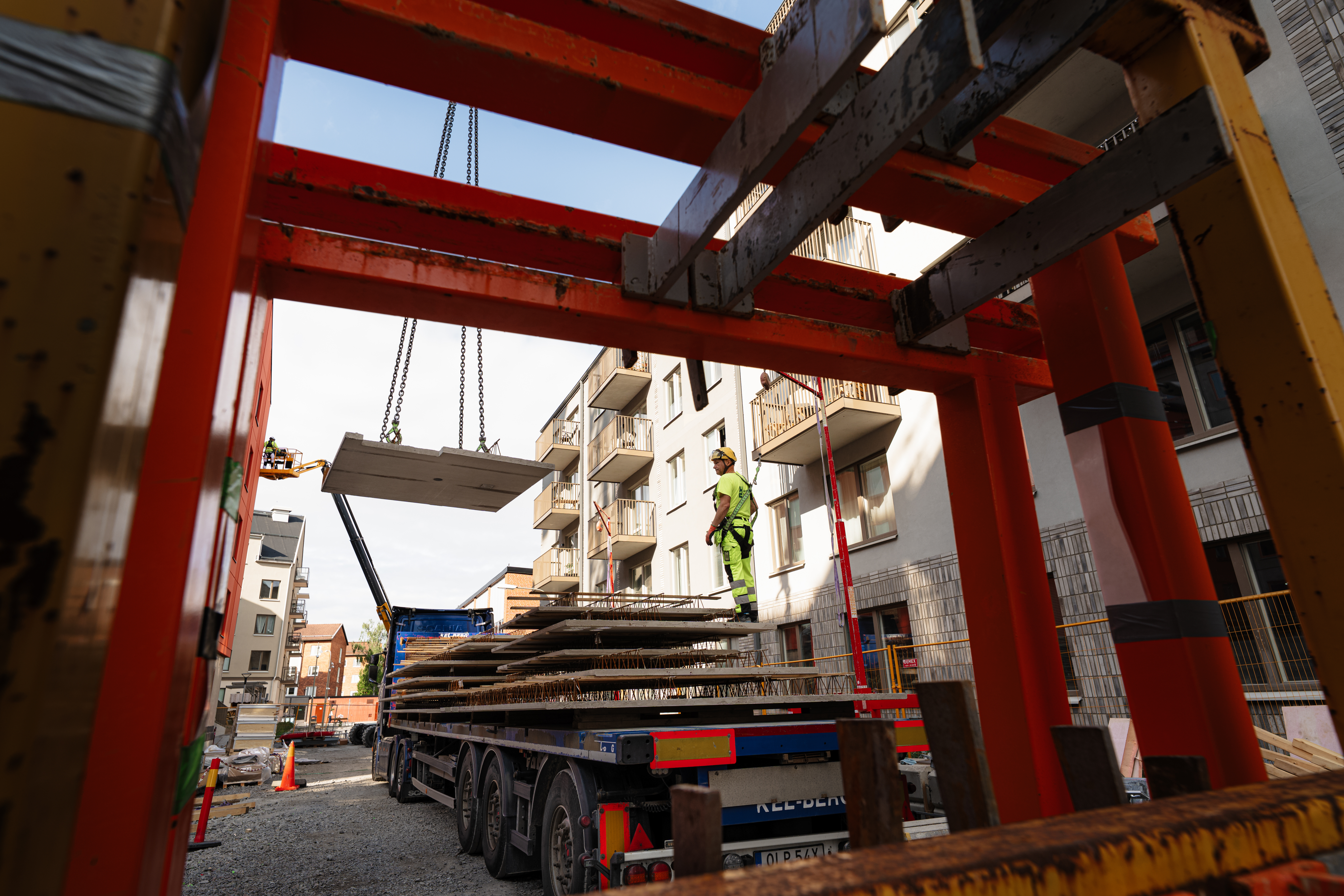 Med vårt nya extra breda plattbärlag kan vi utnyttja både tillåten vikt och bredd fullt ut vid transporterna från fabrik. Det innebär att mer yta levereras per transport – något som minskar klimatavtrycket i projektet.