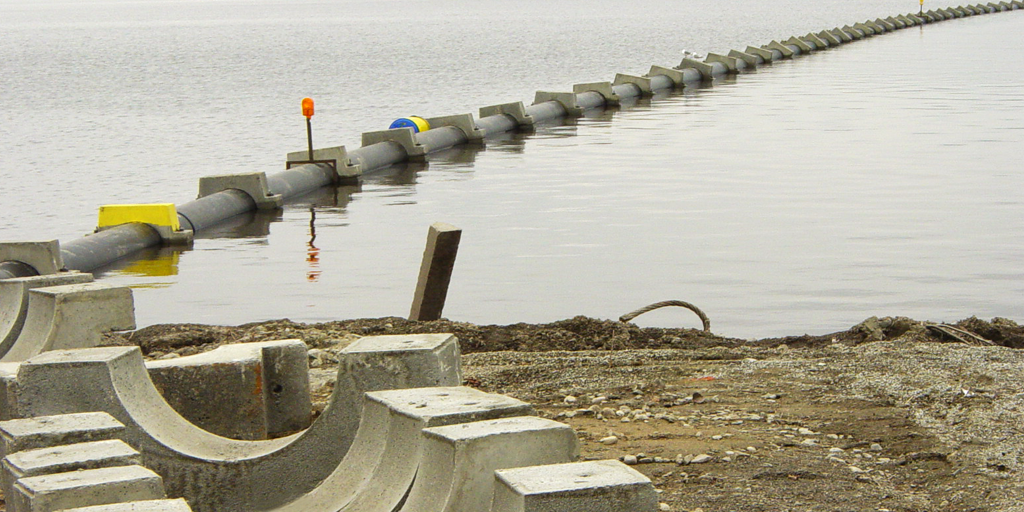 För att sänka vikten och ledningen till botten, släpps luft ut i luftfickans ena ände samtidigt som vatten släpps in i den andra.
